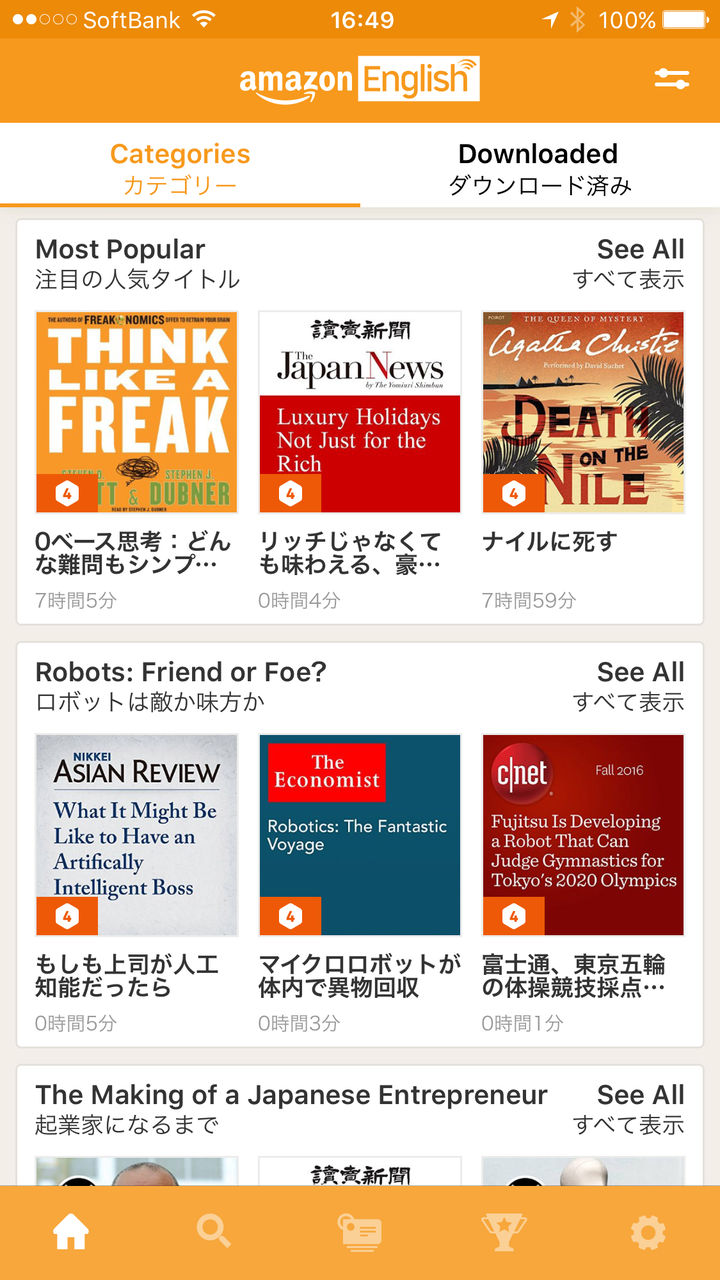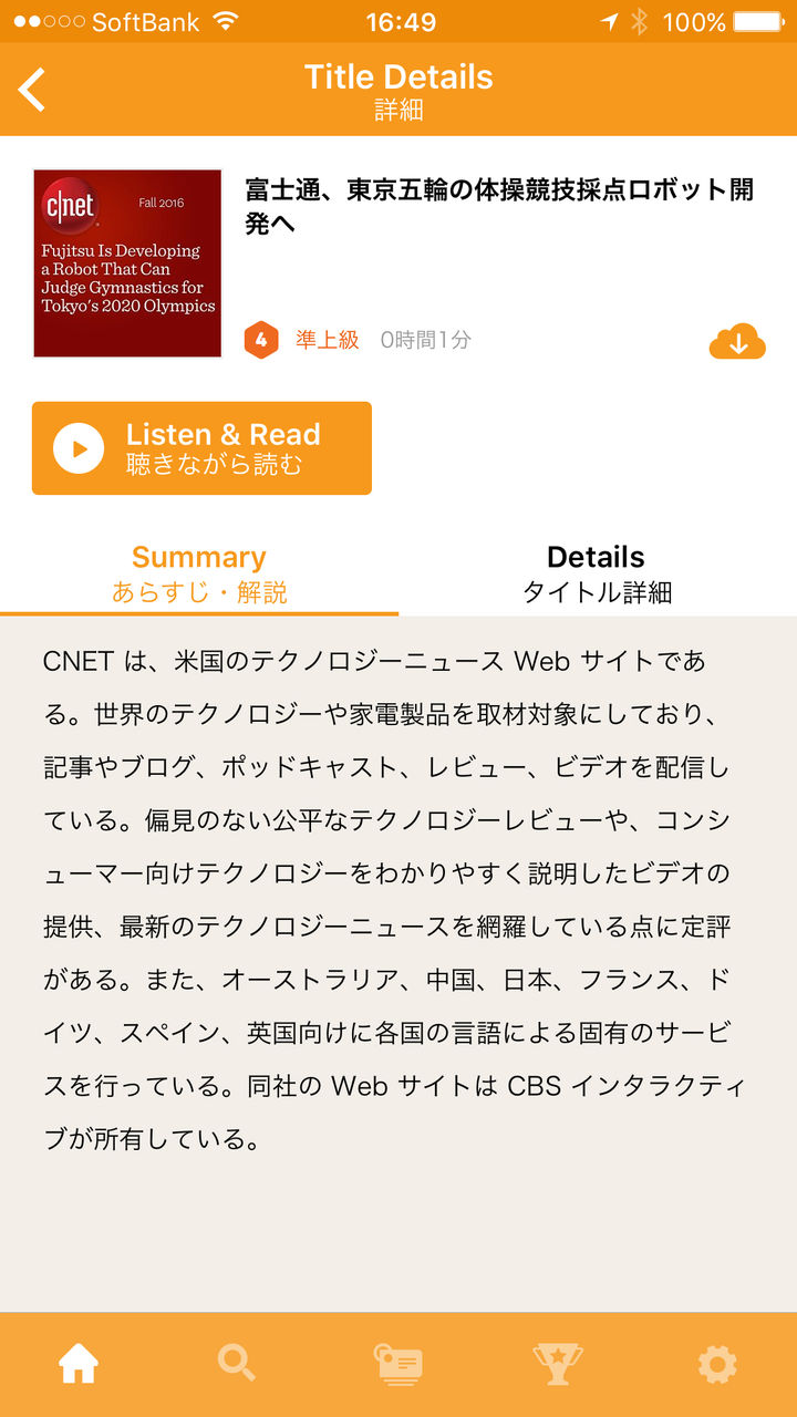 アプリを起動して、メニューに表示されるC-NetだとかThe Economistの英語の時事記事や小説をクリックすると