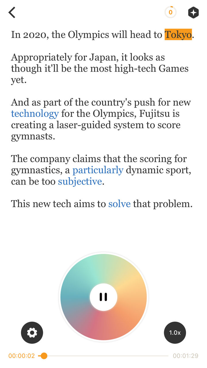 これを押すと文章が表示され、同時にナレーターが読んだ音声が流れ、読んでいる単語がカラオケのように色付きでわかるようになっている。