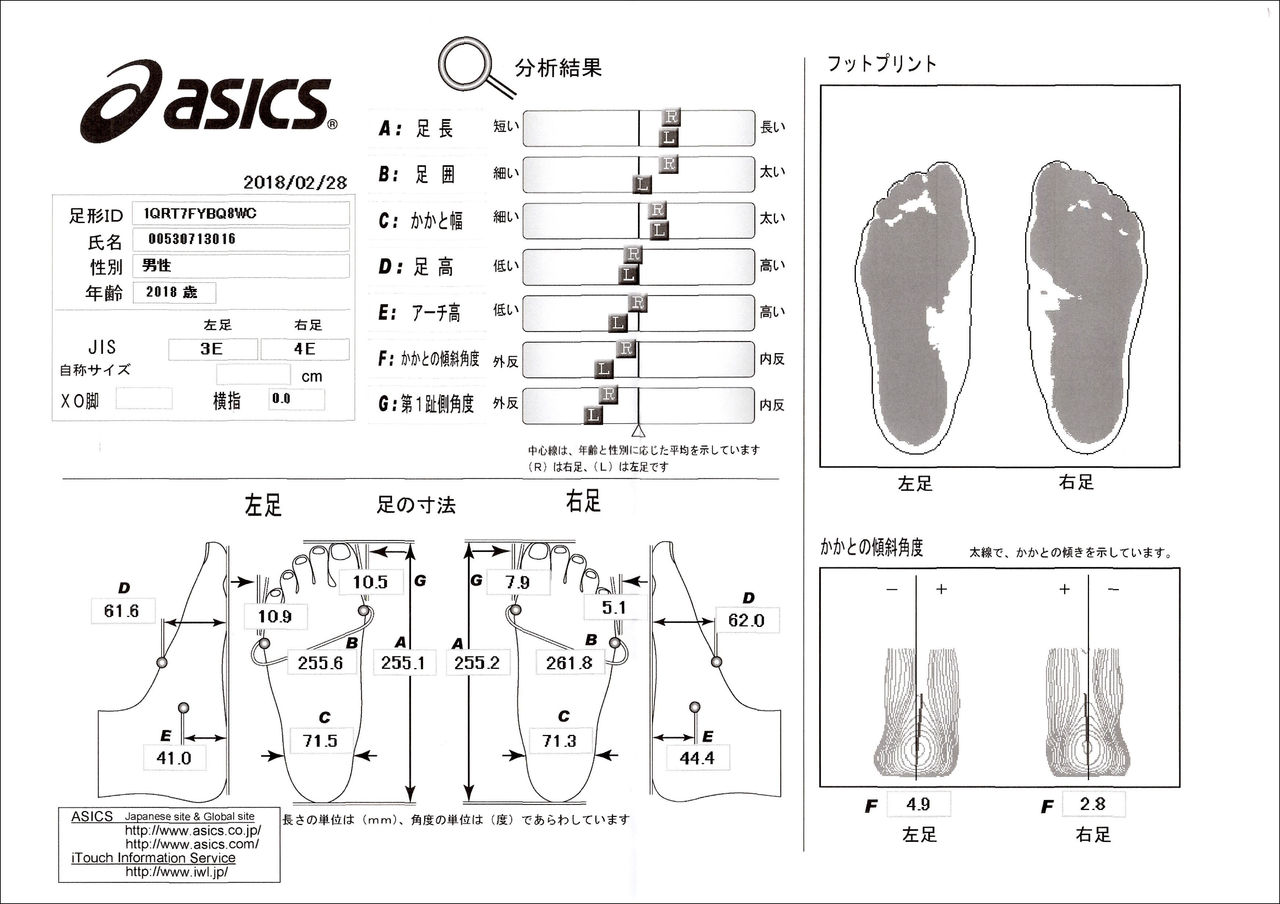 これを見ると、甲高だんびろだと思っていた私の足は全然甲高ではなく、右足は平均、左足はむしろ甲が低いようだ。ピッタリのサイズは25.5cmの、右は4E、左は3Eとのことである。アシックス・ウォーキングの幅のサイズは通常よりもバリエーションがあり、5Eとかもあるそうであるから、これは幅が標準か又はやや狭い部類に入るのだそうである。